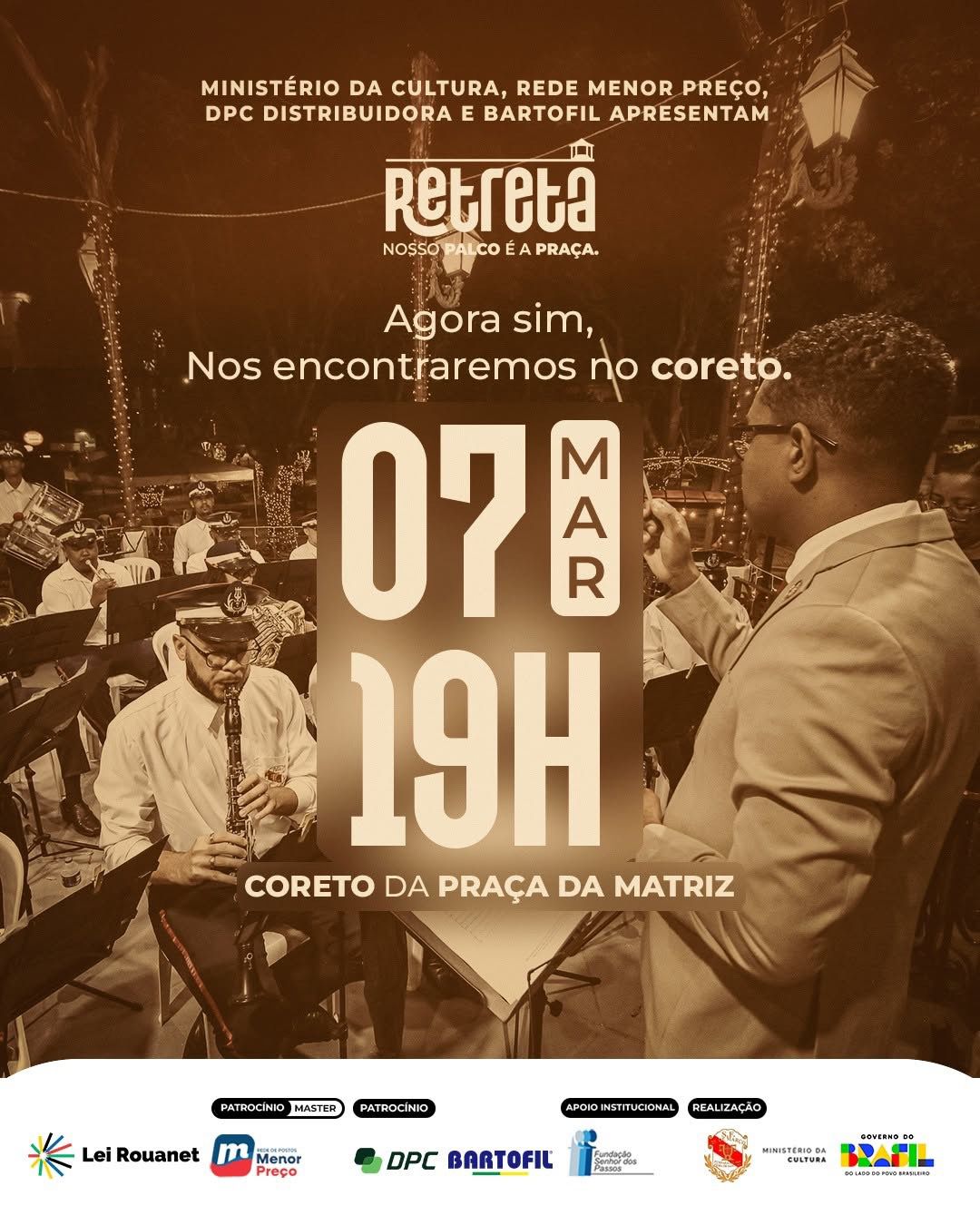 Às 19h, a Sociedade Filarmônica 25 de Março sobe ao coreto e recebe a Sociedade Lítero Musical Minerva Cachoeirana. Música em praça pública e a exposição “Notas de um Tempo Antigo” convidando para uma viagem pela memória da cidade - NA PRAÇA DA MATRIZ |