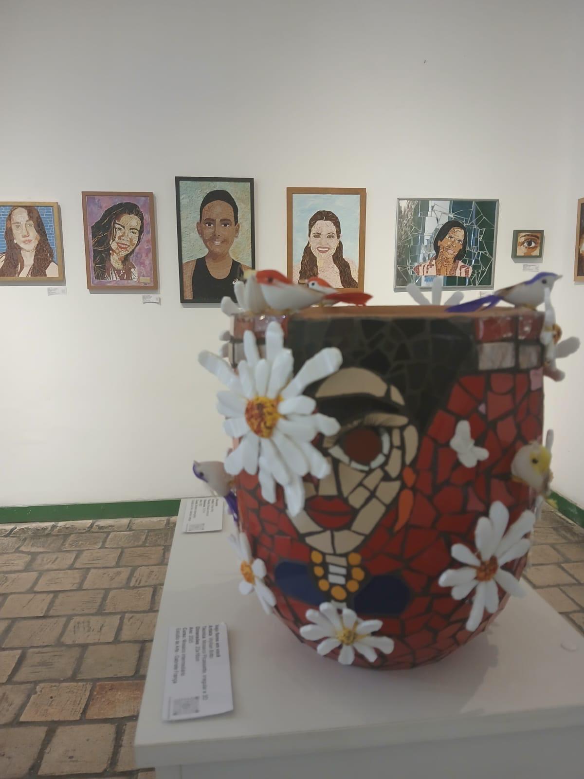 A mostra reúne obras de alunos dos cursos de mosaico iniciante e intermediário, além dos cursos de Rosto em Mosaico e Flores em Picassiette, explorando técnicas como cerâmica, vidro, azulejo, pasta vítrea, entre outras, onde louças, pedaços de pisos e vidros ganham nova vida.