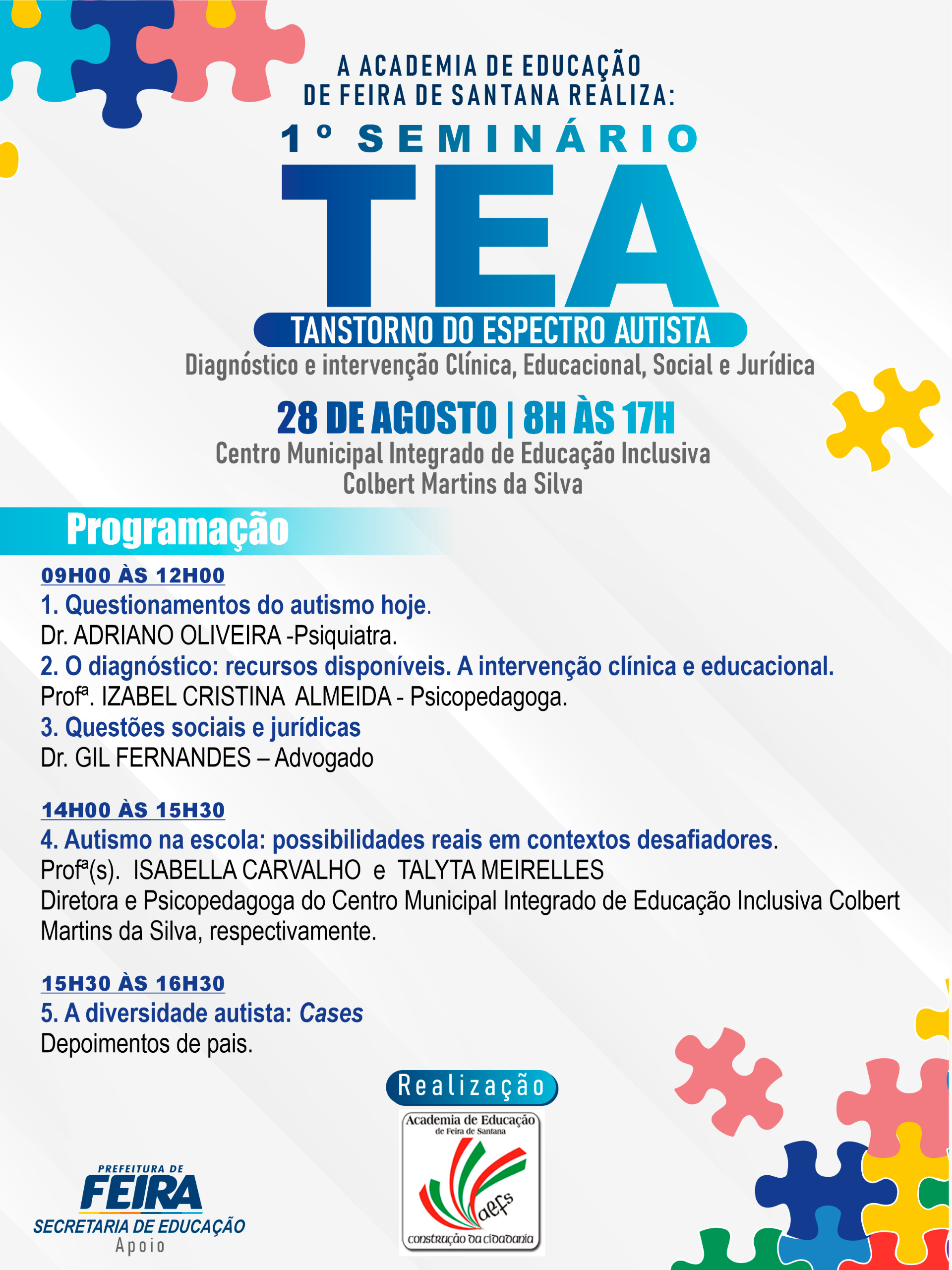 No dia 28 de agosto, aconteceu o I Seminário sobre o Transtorno do Espectro Autista - TEA, com uma participação de mais de 300 pessoas. O Seminário foi promovido pela Academia de Educação de Feira de Santana com o apoio da Secretaria Municipal de Educação e do Jornal Tribuna Feirense, sendo realizado no auditório daquela Secretaria.