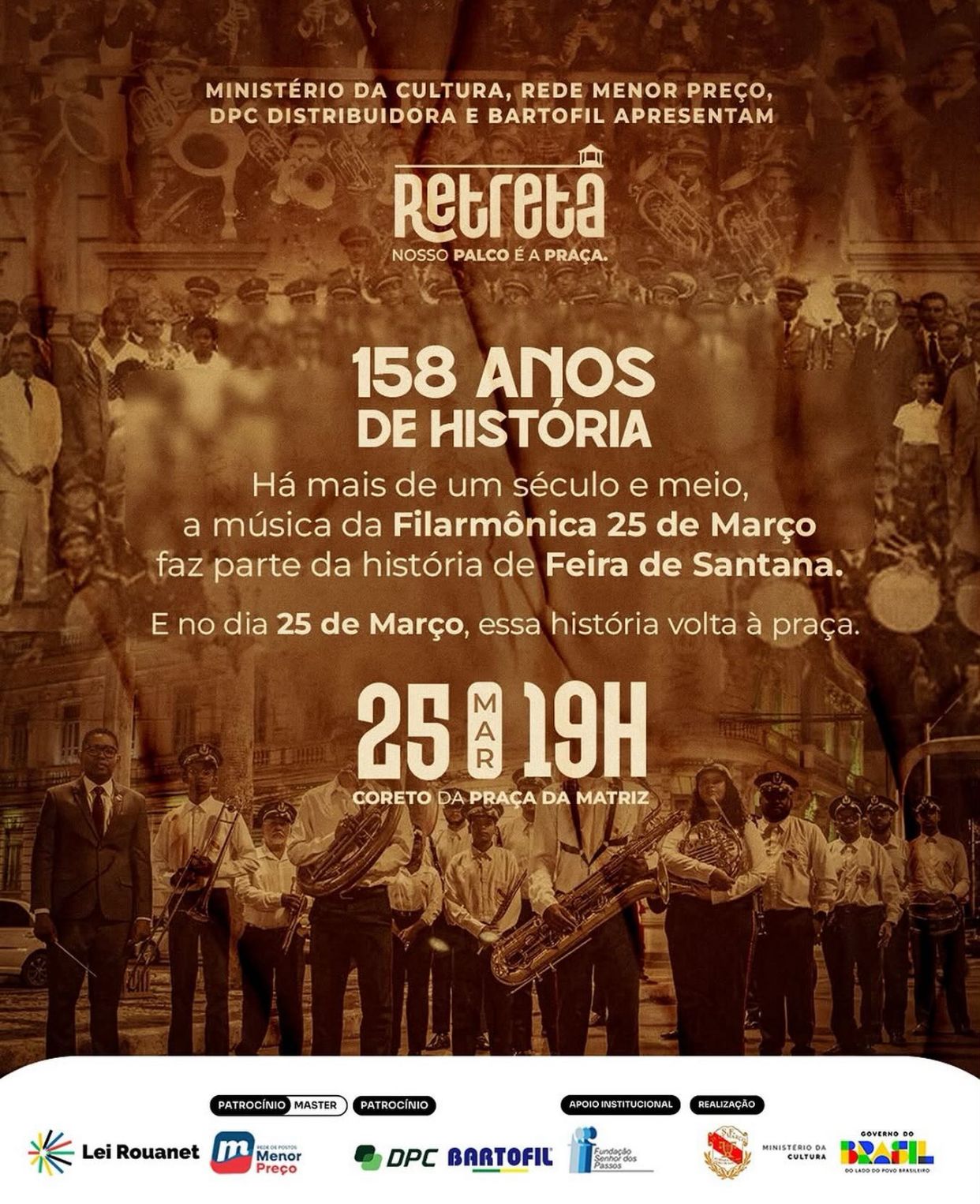 O Projeto Retreta é uma produção da Sociedade Filarmônica 25 de Março, por meio da Lei Rouanet, com patrocínio da Rede Menor Preço, DPC Distribuidora e Bartofil, apoio institucional da Fundação Senhor dos Passos e realização do Ministério da Cultura, Governo do Brasil.