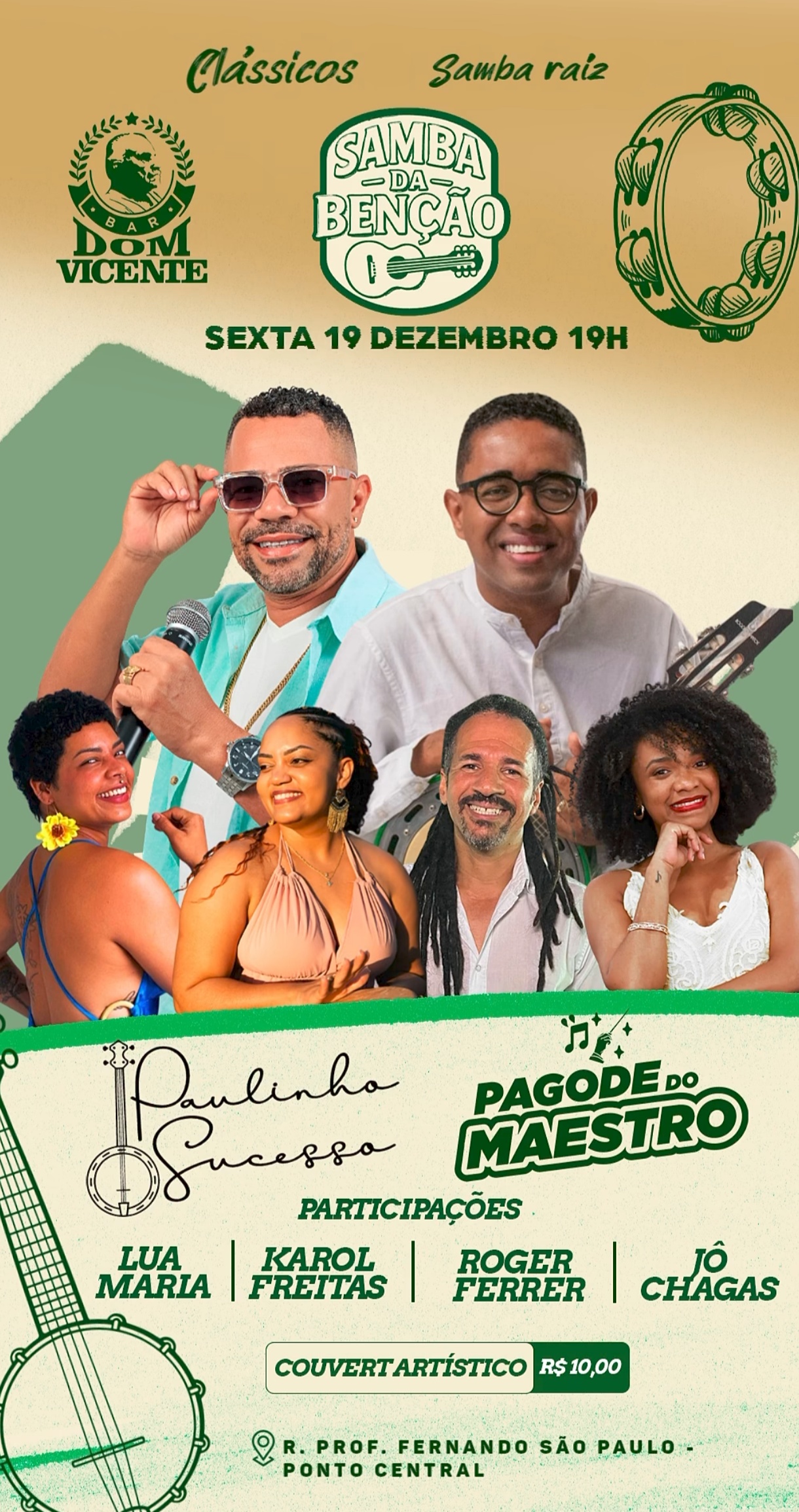 A última edição de 2025 do Samba da Bênção, evento que tem ocorrido desde o mês de outubro no Bar Dom Vicente, acontece nesta sexta-feira (19), a partir das 19h. Desta vez, o evento reúne shows completos do cantor Paulinho Sucesso e do Pagode do Maestro, comandado pelo Maestro Antônio Neves. Em clima de roda de samba, a noite ainda conta com a participação especial de artistas como Lua Maria, Karol Freitas, Roger Ferrer e Jô Chagas. O couvert artístico custa R$ 10,00.