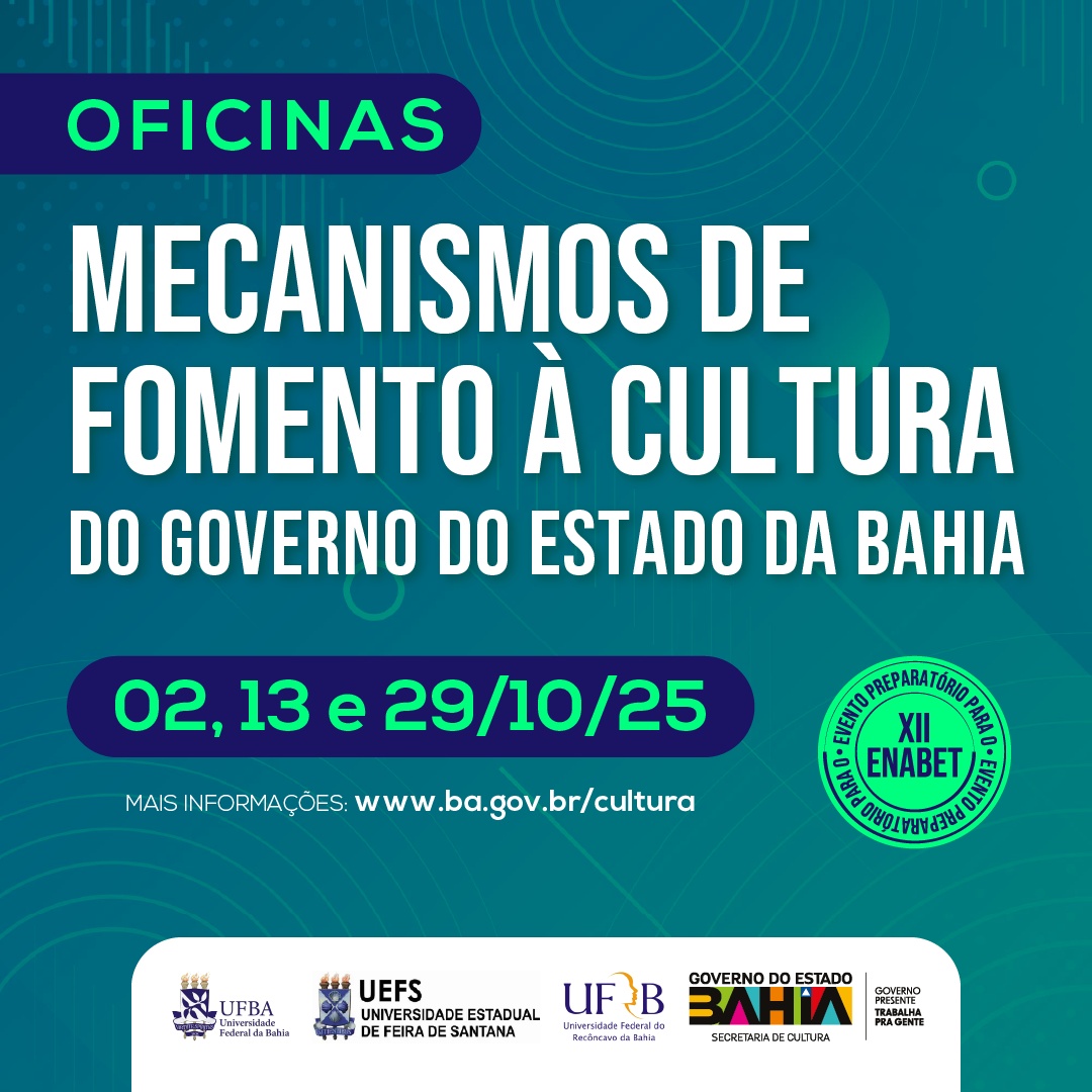 A Secretaria de Cultura do Estado da Bahia (Secult-BA) promove durante o mês de outubro um ciclo de oficinas voltado para estudantes das Universidades Federal da Bahia (UFBA), Estadual de Feira de Santana (UEFS) e Federal do Recôncavo da Bahia (UFRB). As atividades vão apresentar os principais mecanismos de fomento cultural do Estado e estimular maior participação da comunidade acadêmica em editais e projetos que fortalecem a produção artística e a vida cultural baiana.