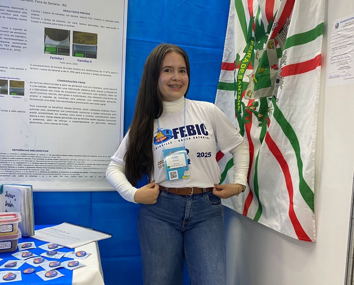 A estudante de Iniciação Científica, Gloria Esther Serra, participou nos dias 8 a 12 de setembro da 10ª FEBIC, a Feira Brasileira de Iniciação Científica, na cidade de Joinville, em Santa Catarina. Como é menor de idade, a estudante fez a viagem com a sua mãe, Patrícia Serra. Esther levou o seu projeto com o título “Desenvolvimento de farinha enriquecida com triptofano como alternativa terapêutica para migrânea em indivíduos com Transtorno do Espectro Autista (TEA)”. Como resultado, conseguiu ganhar o prêmio de melhor projeto do Nordeste.