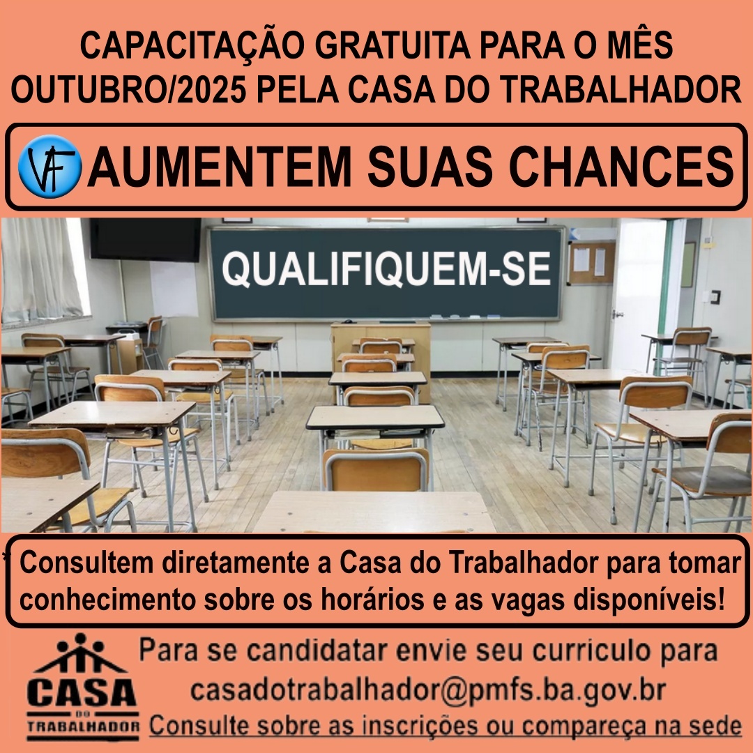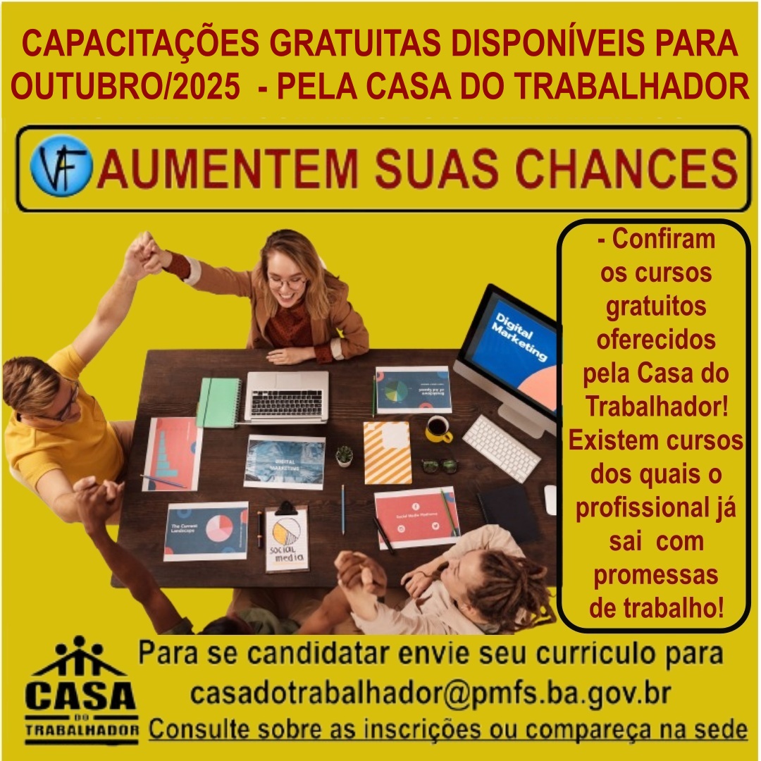 CONFIRAM AS CAPACITAÇÕES GRATUITAS AINDA DISPONÃVEIS PARA O MÊS OUTUBRO/2025 - PELA CASA DO TRABALHADOR