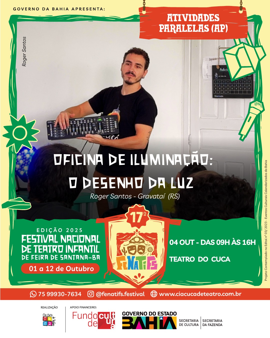 Durante o evento será apresentada a programação completa do festival e também acontecerá a exibição do documentário “Memória do Teatro para as Infâncias e Juventudes da Bahia”, que marca os 27 anos de trabalho da anfitriã do Fenatifs, a Cia. Cuca de Teatro.