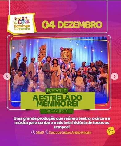 No Domingo Tem Teatro, a diversão inicia antes do espetáculo. Às 09h temos as Atividades Brincantes! Nosso espaço de entretenimento estará aberto com desenhos para colorir, jogos tradicionais, cama elástica, piscina de bolinhas, pinturinha facial e um delicioso lanche. Às 10h30 temos a apresentação do espetáculo teatral.  Reforçamos o convite, vem pro Domingo tem Teatro, aqui a diversão começa cedo!