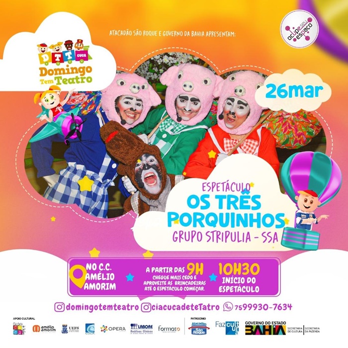Este projeto genuinamente feirense, de ações continuadas, promove apresentações teatrais para crianças e públicos de todas as idades, valorizando artistas e a cultura local. Criado em 2005 por Henrique Motté (1963-2019) e Elizete Destéffani-Motté, o Domingo Tem Teatro construiu uma forte relação de afeto com seu público, promovendo diversão, formação cultural e a construção do pensamento crítico e respeito às diferenças. São 20 anos de dedicação às artes cênicas, voltadas às infâncias e juventudes. Para essa temporada o Projeto conta com o patrocínio do Atacadão São Roque, Pererê Peças e Governo do Estado, através do Fazcultura, Secretaria de Cultura e Secretaria da Fazenda.