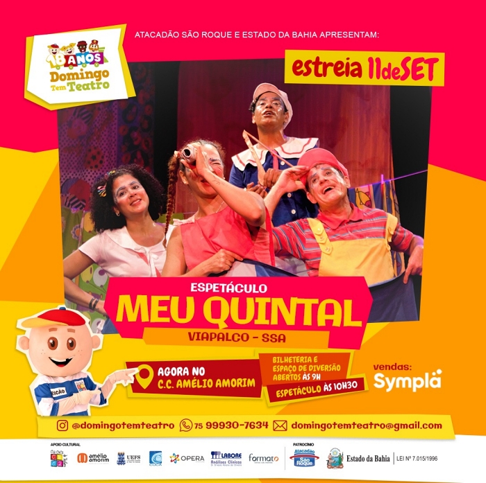 Domingo Tem Teatro, chama todo mundo e vem! Prepare o coração para uma manhã ímpar de pura nostalgia e alegria. No dia 28 de setembro o aclamado grupo Via Palco de Salvador desembarca em Feira de Santana com o espetáculo "Meu Quintal", uma viagem mágica de volta ao quintal da nossa infância onde a imaginação faz a festa e a diversão não precisa de pilhas. Revivendo as brincadeiras que marcaram a nossa história e que ensinam as crianças de hoje a sonhar e dar asas à imaginação, "Meu Quintal" é mais do que uma peça de teatro, é uma experiência sensorial que resgata a magia de um tempo em que um quintal, um varal ou uma simples pedra se transformavam em mundos de aventura. A peça acompanha a divertida jornada de crianças que, sem a necessidade de telas ou brinquedos caros, criam um universo de faz de conta com jogos e músicas feitos por elas mesmas.
