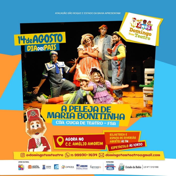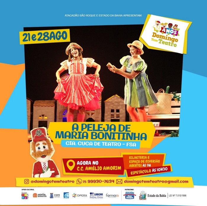 Este projeto genuinamente feirense, de ações continuadas, promove apresentações teatrais para crianças e públicos de todas as idades, valorizando artistas e a cultura local. Criado em 2005 por Henrique Motté (1963-2019) e Elizete Destéffani-Motté, o Domingo Tem Teatro construiu uma forte relação de afeto com seu público, promovendo diversão, formação cultural e a construção do pensamento crítico e respeito às diferenças. São 20 anos de dedicação às artes cênicas, voltadas às infâncias e juventudes. Para essa temporada o Projeto conta com o patrocínio do Atacadão São Roque, Pererê Peças e Governo do Estado, através do Fazcultura, Secretaria de Cultura e Secretaria da Fazenda.