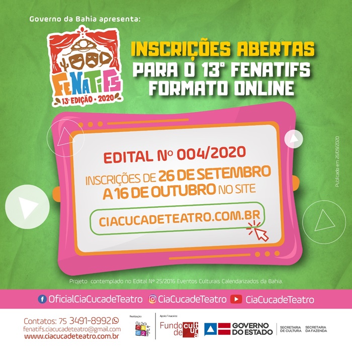 O Fenatifs prossegue até o dia 12 de outubro e conta com o apoio financeiro do Governo do Estado, através do Fundo de Cultura, Secretaria da Fazenda e Secretaria de Cultura da Bahia, através do Edital Nº 03/ 2023 - Eventos Culturais Calendarizados.