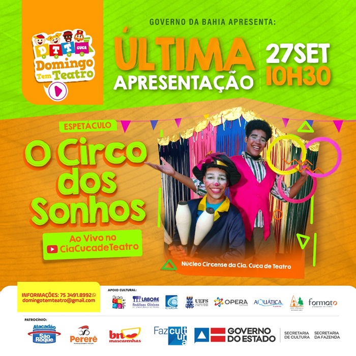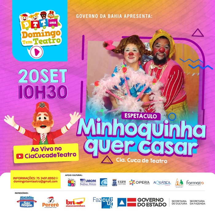 INFORMAÇÕES/PRODUÇÃO: (75) 9.9930-7634 (WhatsApp) | Instagram: @domingotemteatro   |   E-mail: domingotemteatro@gmail.com   |