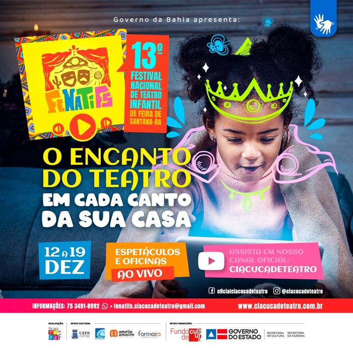 Durante o evento será apresentada a programação completa do festival e também acontecerá a exibição do documentário “Memória do Teatro para as Infâncias e Juventudes da Bahia”, que marca os 27 anos de trabalho da anfitriã do Fenatifs, a Cia. Cuca de Teatro.