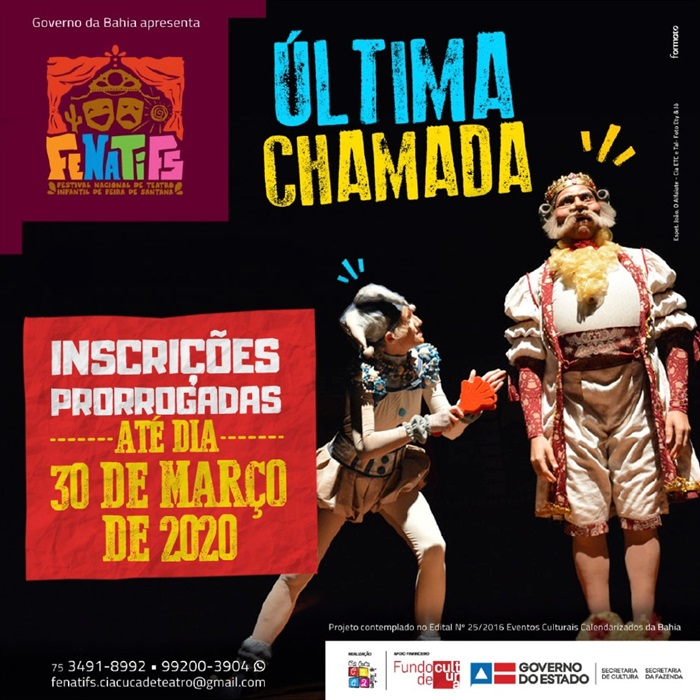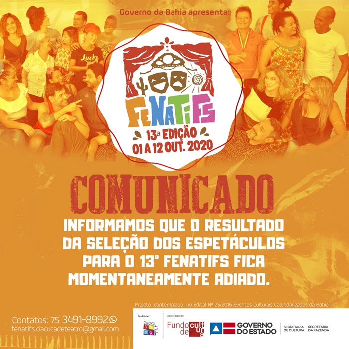 O Fenatifs prossegue até o dia 12 de outubro e conta com o apoio financeiro do Governo do Estado, através do Fundo de Cultura, Secretaria da Fazenda e Secretaria de Cultura da Bahia, através do Edital Nº 03/ 2023 - Eventos Culturais Calendarizados.