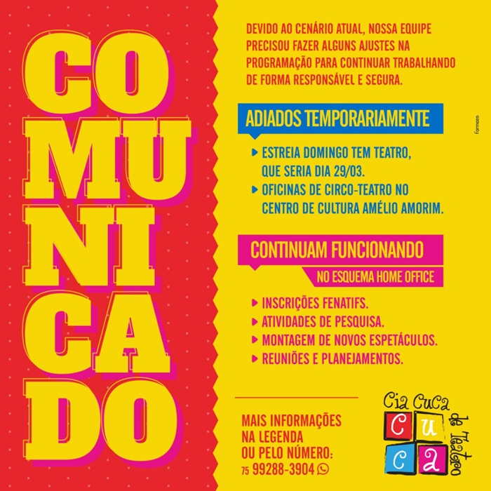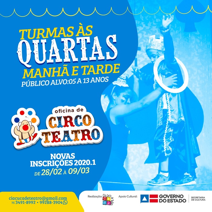 INFORMAÇÕES/PRODUÇÃO: (75) 9.9930-7634 (WhatsApp) | Instagram: @domingotemteatro | E-mail: domingotemteatro@gmail.com | www.ciacucadeteatro.com.br