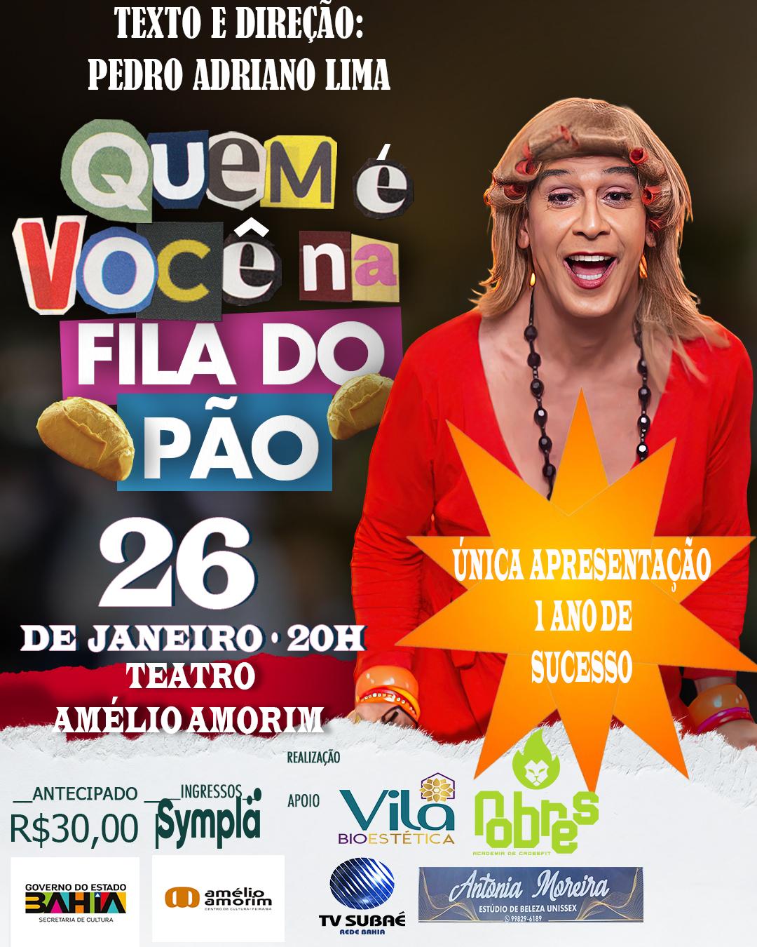 O público pediu e vai acontecer: o espetáculo “Quem é Você na Fila do Pão? Remix” retorna a Feira de Santana em uma apresentação especial — e será a última deste ano na cidade!