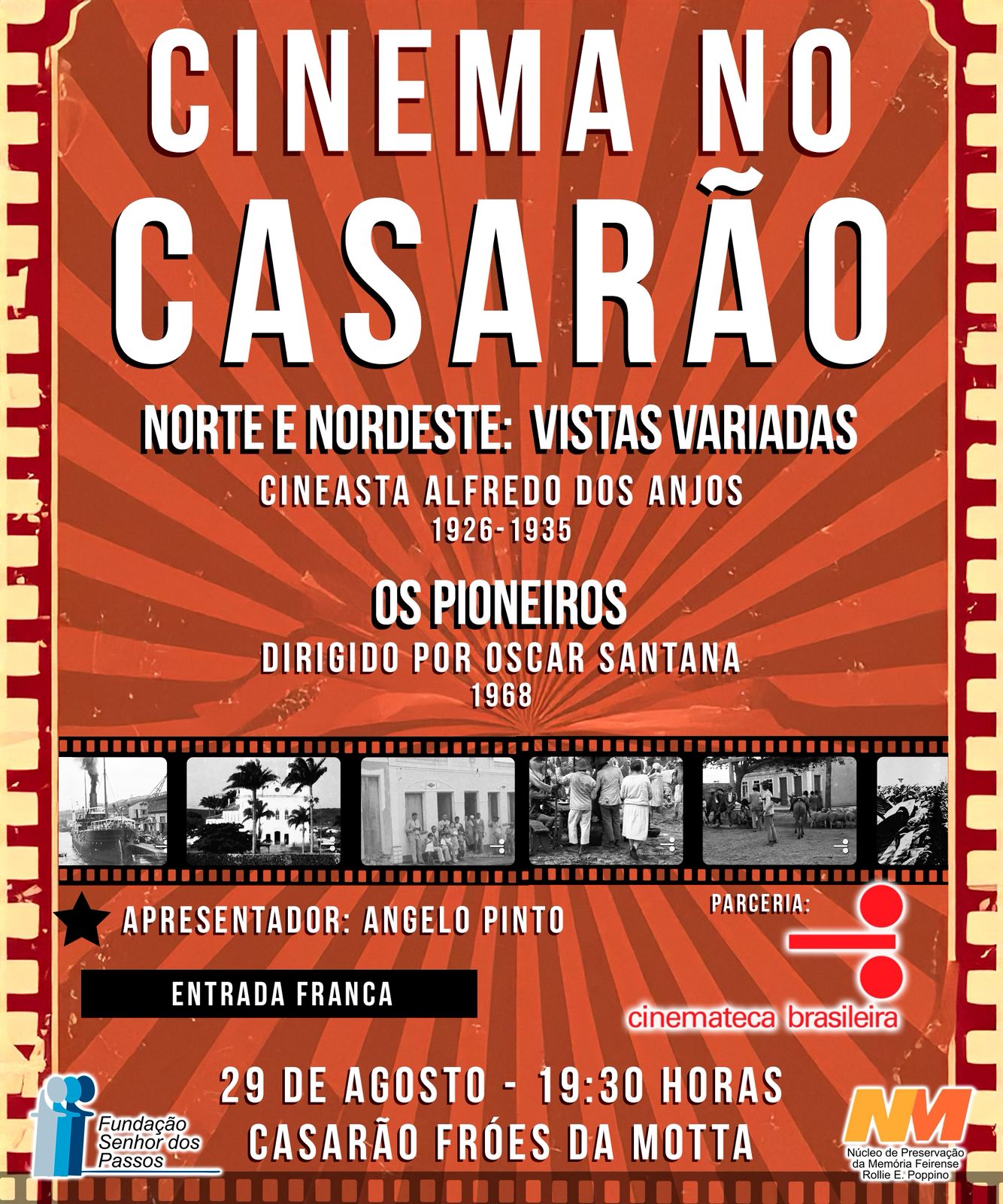 A Fundação Senhor dos Passos e o Núcleo de Preservação da Memória Feirense Rollie Poppino, convidam para mais uma edição do Projeto CINEMA NO CASARÃO em parceria com a Cinemateca Brasileira, que acontece no dia 29 de agosto de 2025 às 19:30 horas no Casarão Fróes da Motta em Feira de Santana, com apresentação do professor e fotógrafo José Angelo Leite Pinto e projeção de dois filmes documentários. O evento é gratuito aberto ao público em geral.