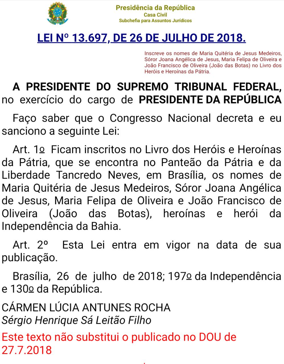 A Ministra Cármen Lúcia Antunes Rocha, no exercício da Presidência da República, no último dia 26 de julho do ano em curso, coincidentemente o dia da padroeira da terra de Maria Quitéria, sancionou a lei que inclui nossa heroína no PANTEÃO E DA LIBERDADE TANCREDO NEVES, homenagem justa que já deveria ter acontecido há muito mais tempo.
