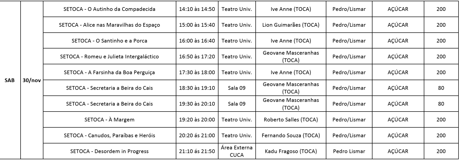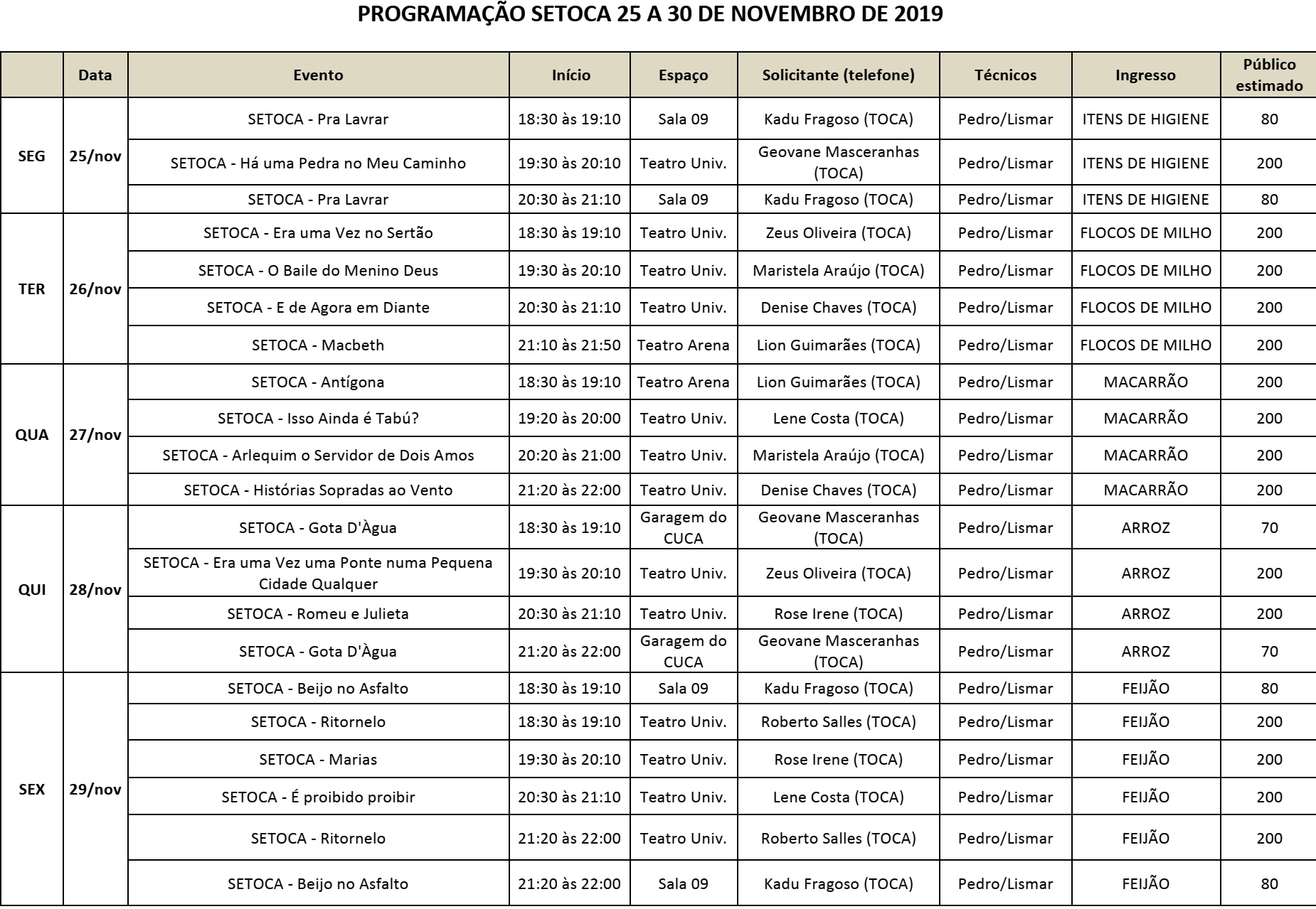 Já na próxima semana, de segunda-feira à sábado (25 a 30/11), ocorrerá a “Semana do Teatro Oficina do Cuca (Setoca)”. Ao todo ocorrerão mais de 25 espetáculos teatrais. Para cada dia da programação,o público deverá doar um tipo de donativo: segunda – 3 itens de material de higiene pessoal ; terça – 2 pacotes de floco de milho; quarta – 2 pacotes de macarrão; quinta – 1kg de arroz; sexta – 1kg de feijão; sábado dia – 1kg de açúcar; sábado noite – 1kg de farinha. Confira a