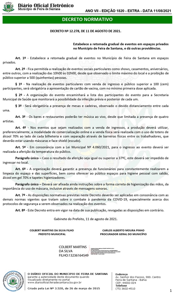 A Prefeitura de Feira de Santana autorizou a retomada gradual de eventos privados, como shows, casamentos e aniversários, das 10h às 2h, desde que seja obedecido a quantidade máxima de 500 pessoas.