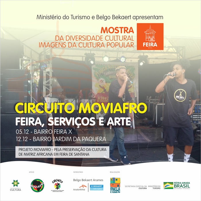 O Circuito Moviafro é um dos 20 projetos contemplados na Mostra da Diversidade Cultural - 2021, um edital que tem a realização da ONG Favela é Isso Aí, Secretaria Especial da Cultura do Ministério do Turismo e Governo Federal e Belgo Bekaert Arames, viabilizada por meio da Lei Federal de Incentivo à Cultura, e faz parte do programa Belgo Bekaert Forma e Transforma, que busca promover ações de pesquisa, registro e difusão do patrimônio imaterial em Feira de Santana desde 2016.