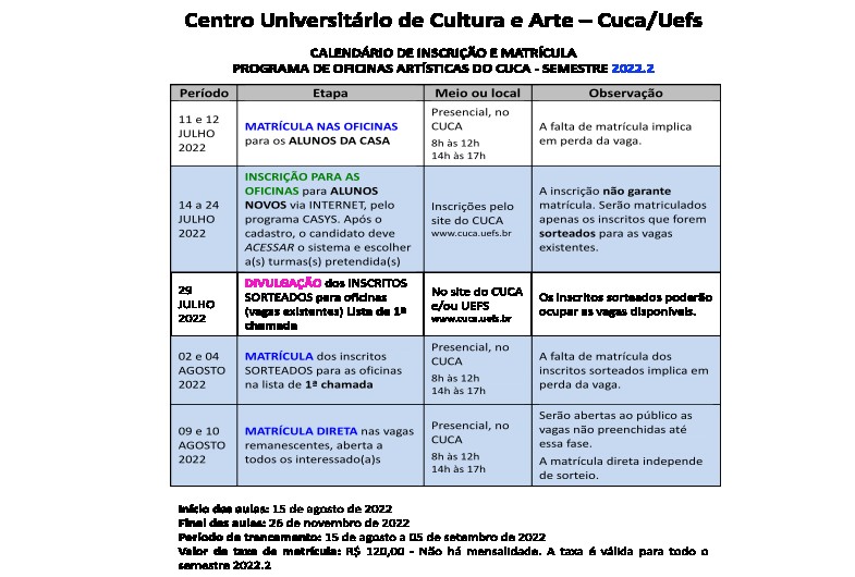 A Universidade Estadual de Feira de Santana (UEFS), através do Centro Universitário de Cultura e Arte(CUCA), torna pública a abertura de inscrições de projetos de exposição para a pauta 2023, da Galeria de Artes Carlo Barbosa, como parte da política cultural da UEFS, de valorização e difusão das diferentes linguagens artísticas e formas de expressão cultural, oferecendo espaços alternativos ao Circuito das Galerias comerciais de arte e abrindo o campo para novos talentos.