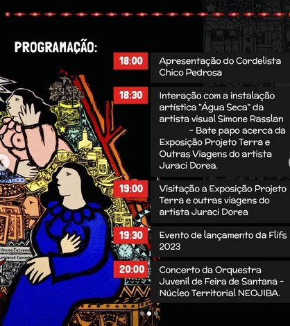 Você é nosso(a) convidado(a) para o Lançamento da FLIFS - Festival Literário e Cultural de Feira de Santana, dia 25/08, às 18h, no Centro Cultural Sesc Feira de Santana @sescfeiradesantana . A programação será formada também pela Vernissage da Exposição "Projeto Terra e Outras Viagens" de Juraci Dórea, a apresentação do Cordelista Chico Pedrosa e o Concerto da Orquestra Juvenil de Feira de Santana - Núcleo Territorial Neojibá!