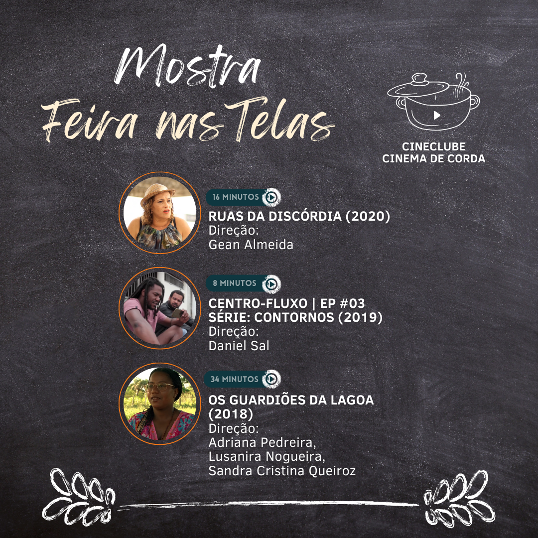 O Museu de Arte Contemporânea Raimundo Oliveira - MAC recebe neste sábado, 09/09, às 13h30, a primeira mostra do cineclube Cinema de Corda. Intitulada "Feira nas Telas", a atividade propõe uma discussão sobre os diferentes aspectos que compõem o mosaico social, cultural e artístico de Feira de Santana. A entrada é gratuita e aberta ao público e conta com os curtas-metragem Ruas da Discórdia (2020) e Os Guardiões da Lagoa (2020); e o episódio Centro-Fluxo da série Contornos (2019) na programação.