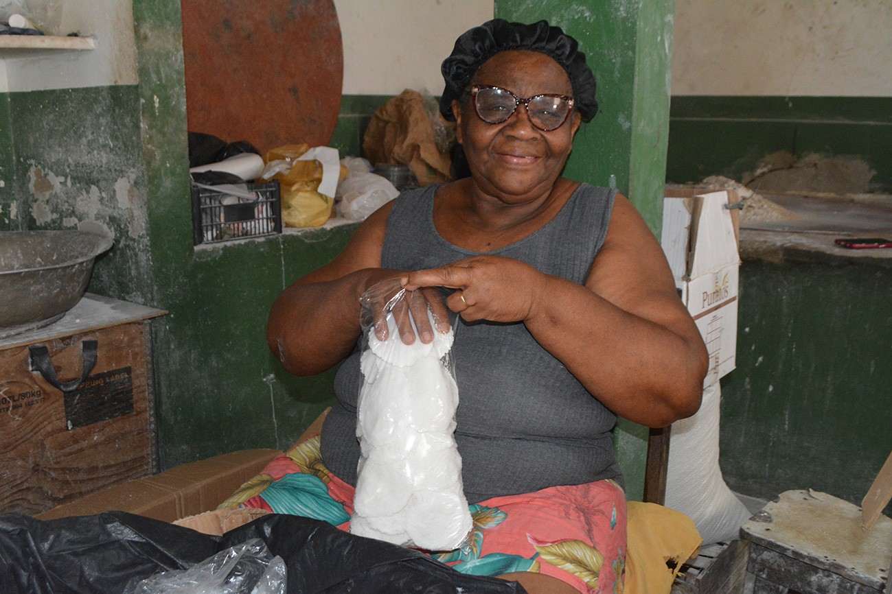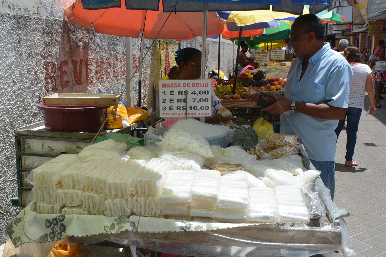 Há oito anos, Leide Silva, 40 anos, vende beiju na praça Bernardino Bahia, local onde atua há quase duas décadas. Moradora do distrito de Tiquaruçu, ela comercializa goma, beijus recheados, massa de aipim, tapioca e biscoitos produzidos de modo artesanal. Diz que parte dessa mercadoria vem de Maria Quitéria (São José) – a outra de Coité, na região sisaleira.