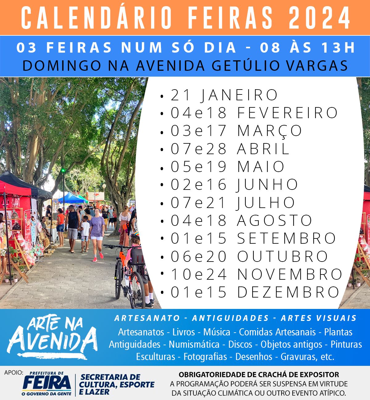 A feira de arte e artesanato no canteiro central da avenida Getúlio Vargas serão retomadas em 21 de janeiro (domingo). Após esta data, vai acontecer nos dias 4 e 18 de fevereiro.