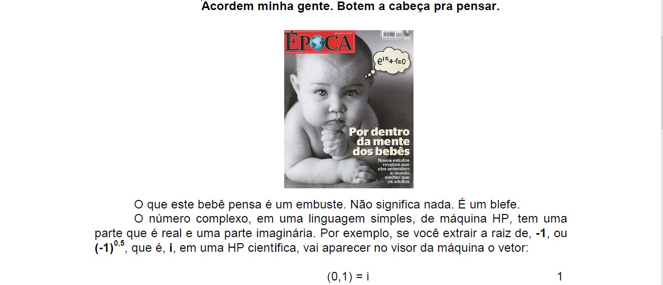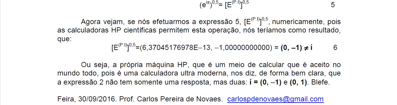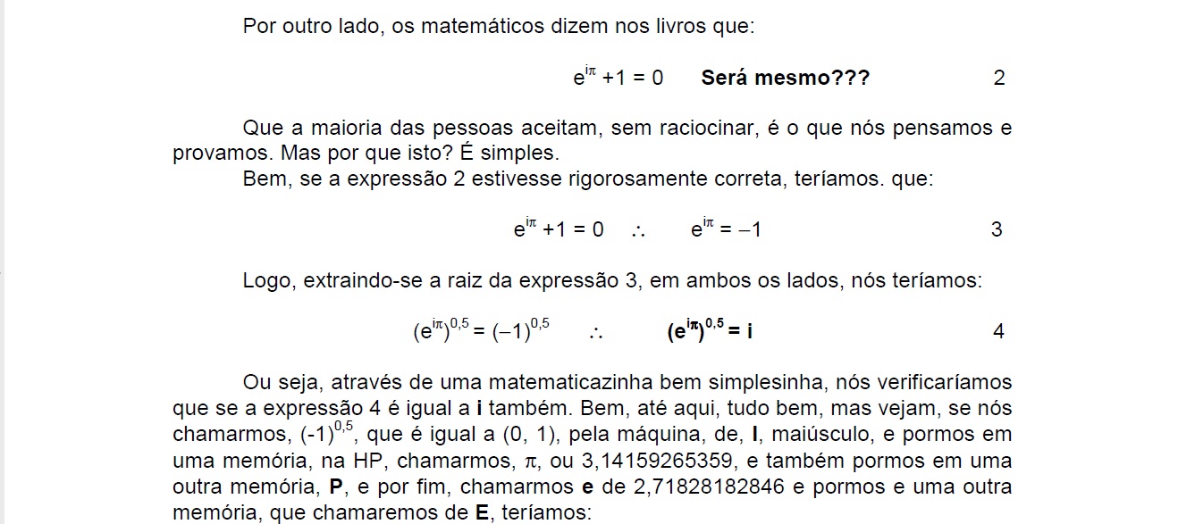 "Uma coisa que ele gostaria de ver", como deixa claro em seus dados biográficos nos livros de sua lavra, "é esse alunado de matemática e seus professores o contestarem com argumentos sólidos sobre estes assuntos que trata" em seus livros "e não só com opiniões dogmáticas sobre os mesmos, onde se nota a tibieza das opiniões destes sectários das opiniões centenárias, muitas vezes, sem as mínimas condições de serem aprovadas hoje em dia, como é a tal igualdade de Euler, eiπ + 1 = 0," que conta, "e com uma simples HP" o que mostra no inicio do livro acima referido.