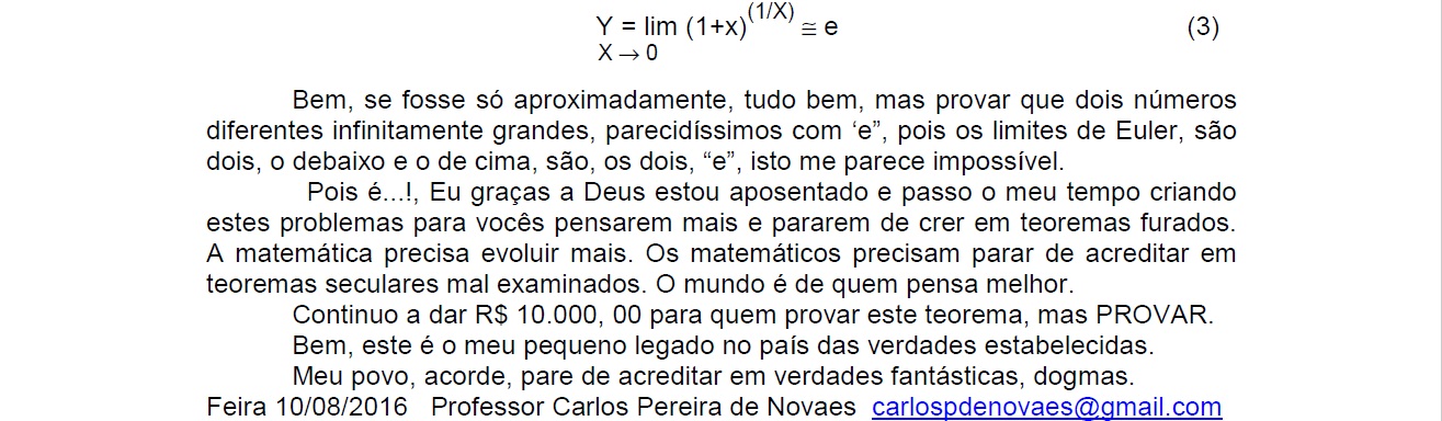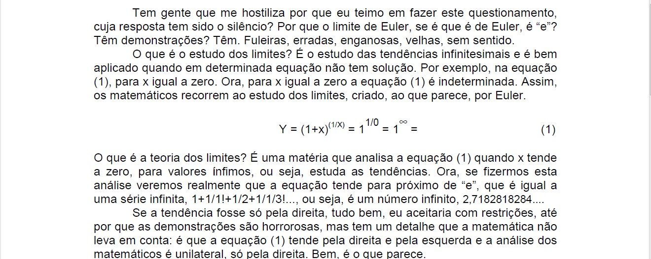 "Uma coisa que ele gostaria de ver", como deixa claro em seus dados biográficos nos livros de sua lavra, "é esse alunado de matemática e seus professores o contestarem com argumentos sólidos sobre estes assuntos que trata" em seus livros "e não só com opiniões dogmáticas sobre os mesmos, onde se nota a tibieza das opiniões destes sectários das opiniões centenárias, muitas vezes, sem as mínimas condições de serem aprovadas hoje em dia, como é a tal igualdade de Euler, eiπ + 1 = 0," que conta, "e com uma simples HP" o que mostra no inicio do livro acima referido.